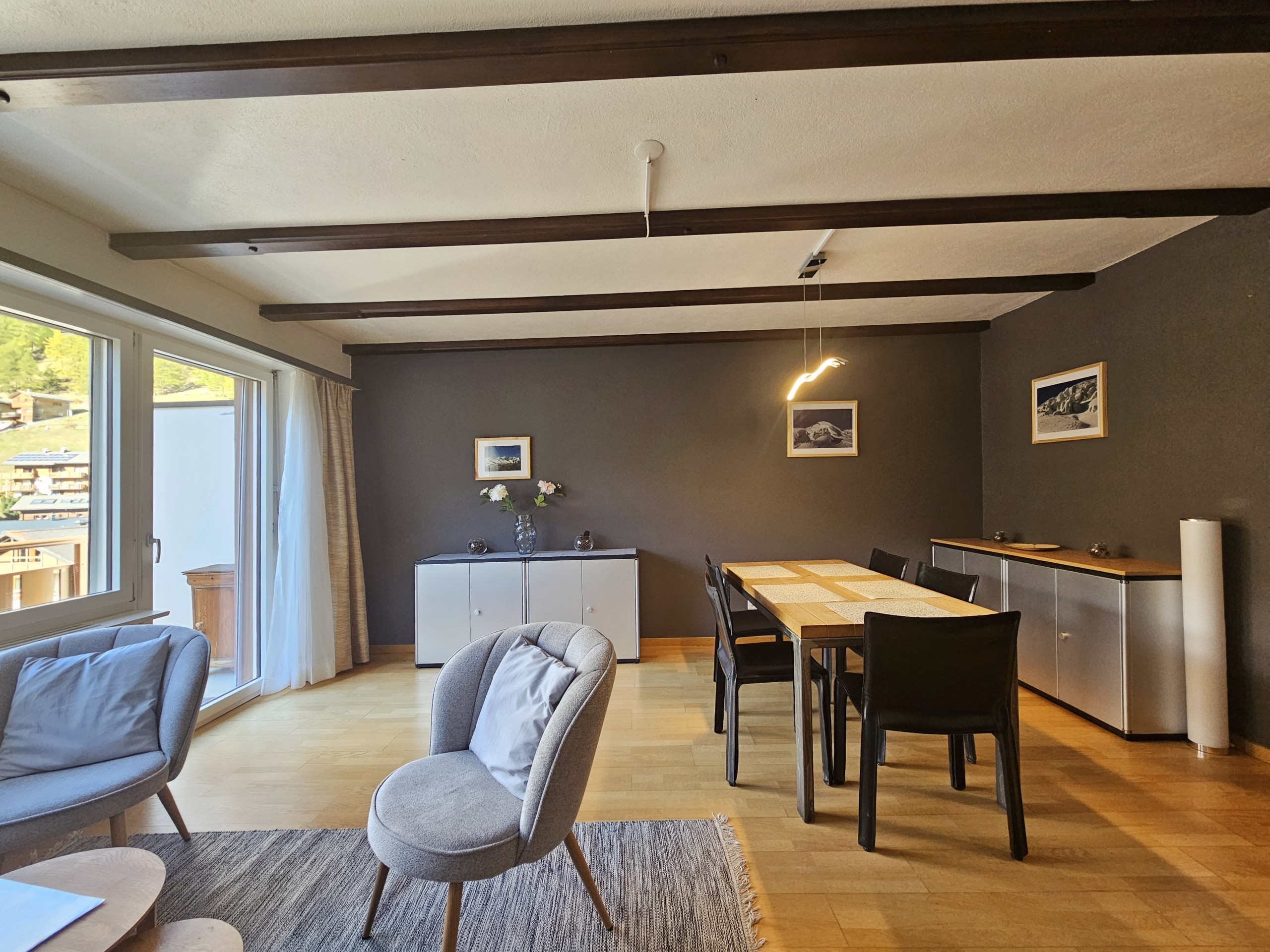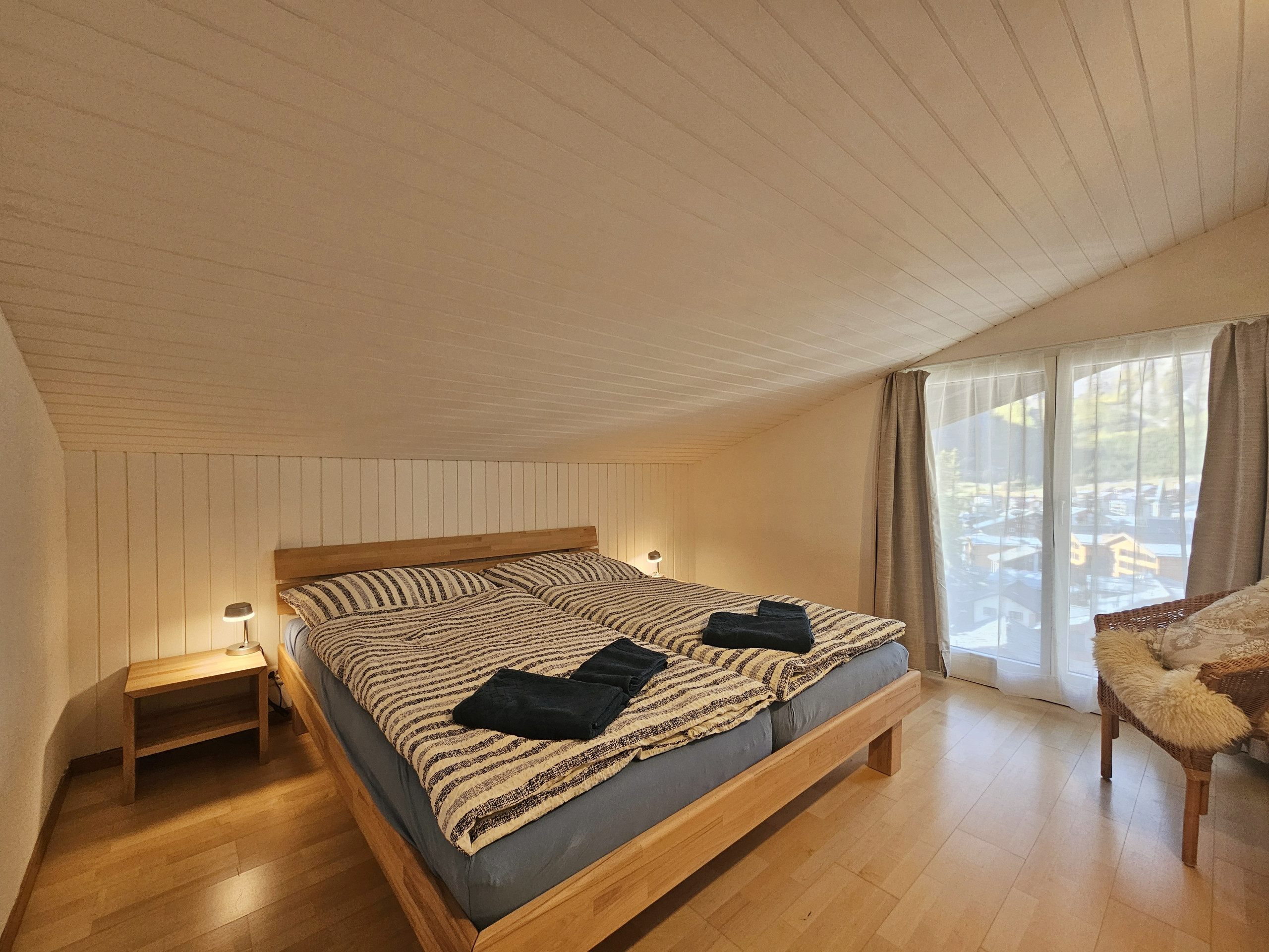 The bright 3-room apartment is located on the 3rd floor of the Cresta house and offers space for up to five people. It has a bedroom with two single beds and another bedroom with three single beds. The bathroom is equipped with a bathtub and a toilet.