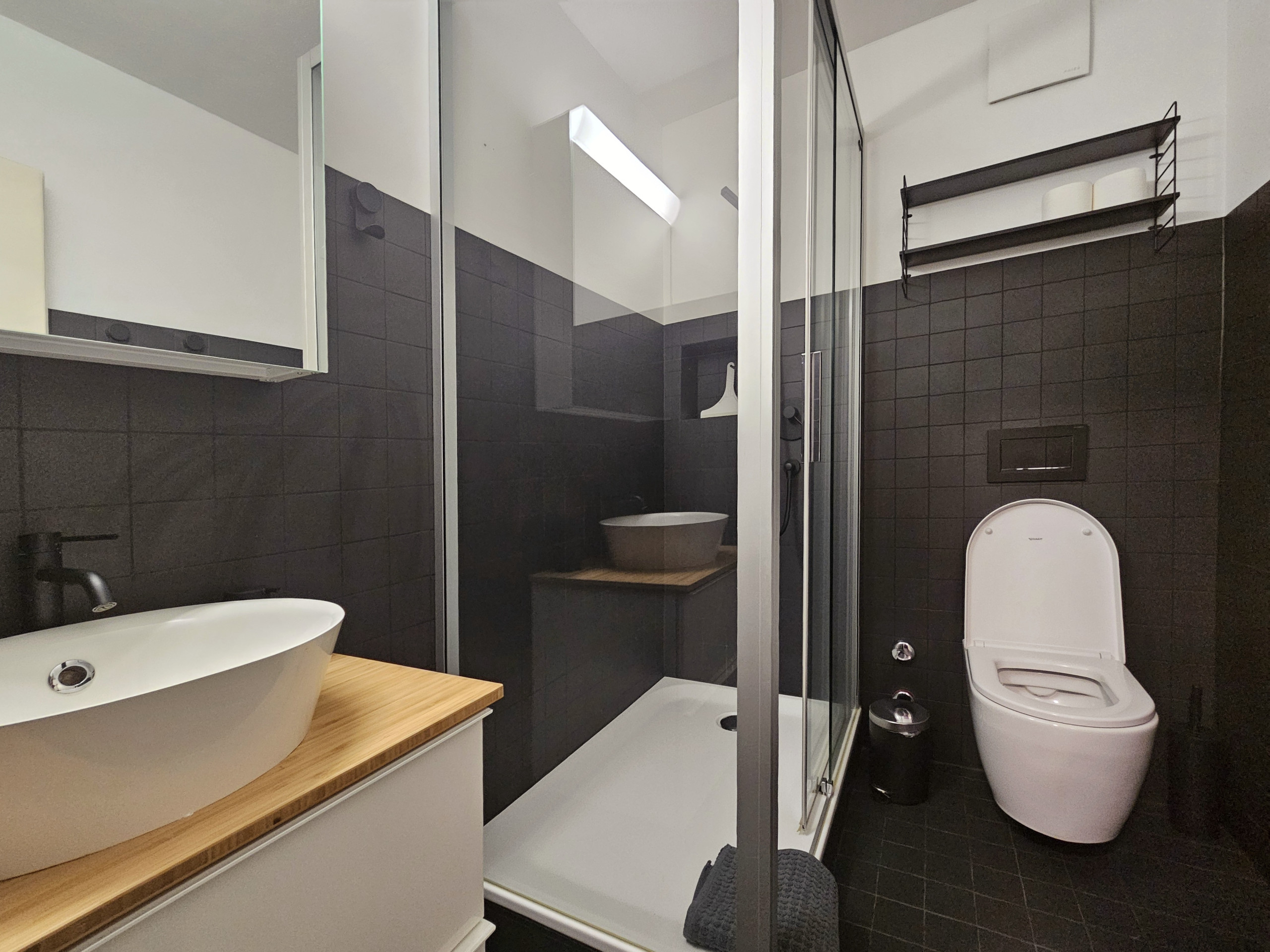Au rez-de-chaussée, les invités trouvent la cuisine (sans lave-vaisselle) et l'espace repas/séjour confortable. De là, les invités peuvent accéder à la pièce maîtresse de l'appartement, le balcon exposé au sud. La salle de bain plus grande avec douche, lavabo et toilettes se trouve également à cet étage.